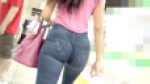 [[音声付き]] 一見何の変哲も無い、スリムデニムかと思ったのですが、左右にブルンブルン揺れる肉尻を目の当たりにして、さっそく追跡開始!やはり、デニム柄をプリントした、ぺらぺらのレギパンでした。 いや …